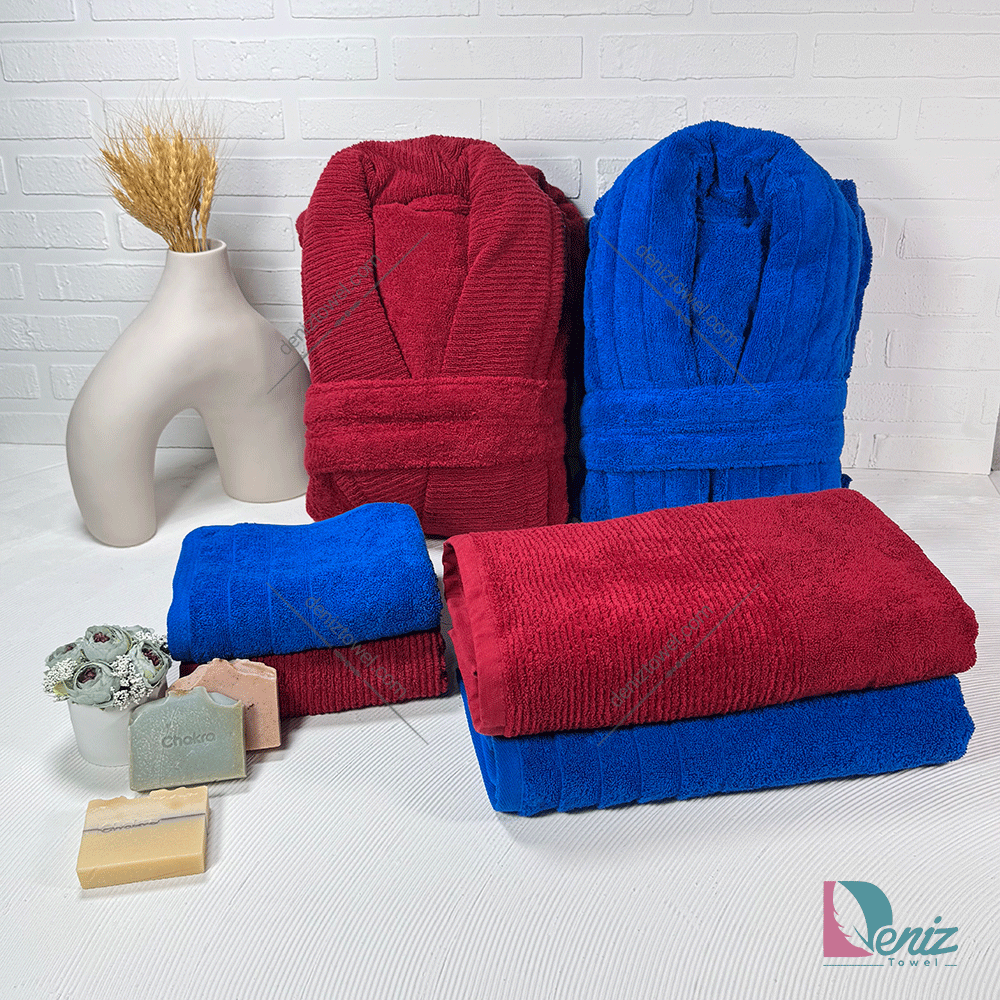 حوله ست دو نفره روویتا رنگ زرشکی و آبی کاربنی بی شک جزو زیبا و به روز ترین ست های دو نفره و عروس و داماد در بازار دانست، یک ست کامل که با توجه به جنس و کیفیت مواد اولیه، محبوب است. این ست دو نفره دارای ده تکه حوله کاربردی شامل: دو عدد حوله تن پوش، دو عدد حوله استخری، دو عدد حوله دستی و دو جفت دمپایی حوله ای می باشد که از جنس تمام پنبه بوده و از لحاظ آب گیری و وزن نیز استاندارد است.
