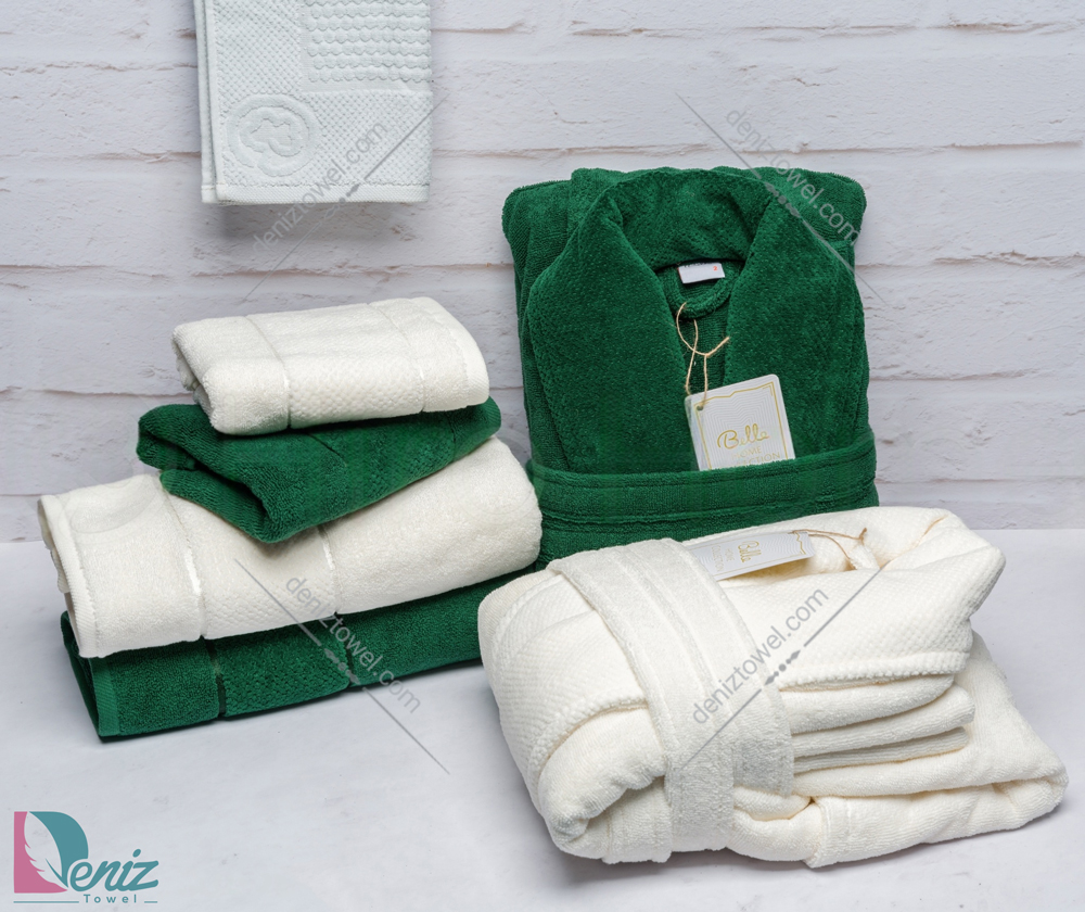 حوله ست دو نفره طرح ماکرو رنگ شیری و یشمی را می توان به جرئت جزو اعلا ترین ست های حوله زنانه و مردانه در بازار دانست، یک ست صادراتی که با توجه به جنس و کیفیت بسیار بالایش اعتماد بسیاری از مصرف کننده ها را جلب نموده است، این ست دو نفره دارای ۱۱ تکه حوله کاربردی شامل: دو عدد حوله تن پوش، دو عدد حوله استخری، دو عدد حوله دستی، دو جفت دمپایی حوله ای و یک عدد زیرپایی می باشد که از جنس مخمل کتان بوده و از لحاظ آب گیری و وزن نیز استاندارد می باشد.