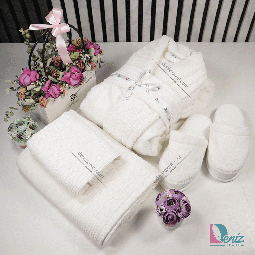 | تعداد تکه | ۴ تکه: حوله تن پوش، یک جفت دمپایی حوله ای، حوله دستی، حوله استخری |